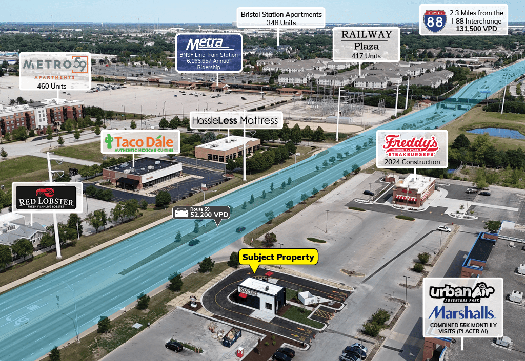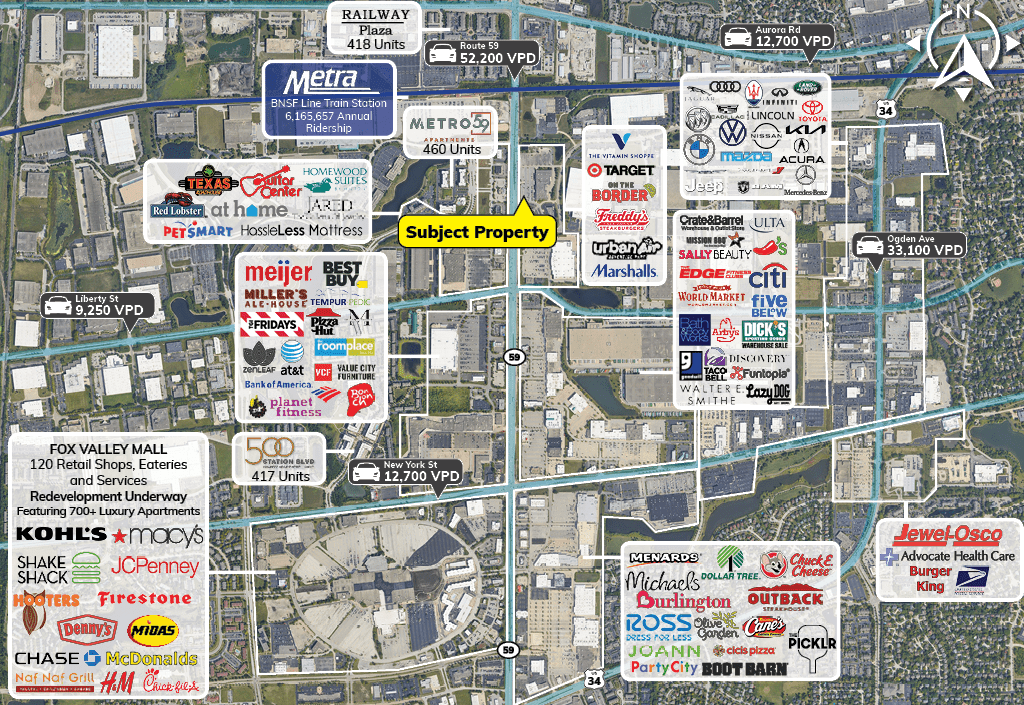 • Morning Side of Traffic | 2.3 Miles from the Interstate 88 Interchange – 131,500 Vehicles per Day | Accessible from Route 59 | 52,200 Vehicles per Day