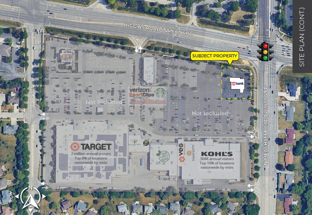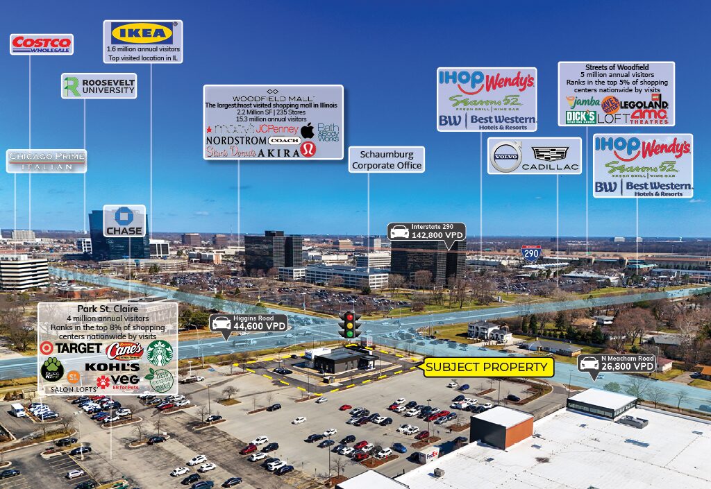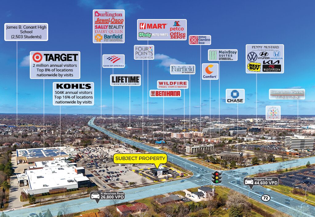 - Located at the signalized intersection of Higgins Road and N Meacham Road, which sees a combined traffic volume of 71,400 vehicles per day